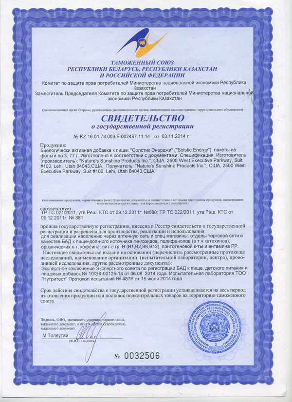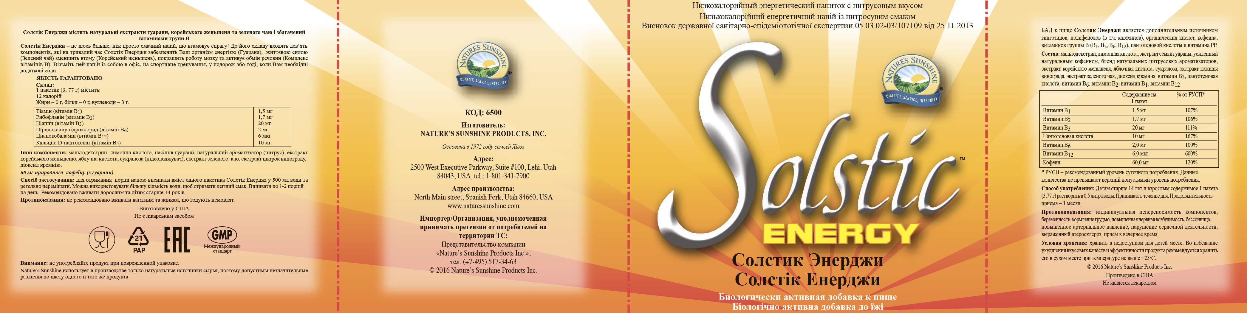 БАД к пище Солстик Энерджи является дополнительным источником гингозидов, полифенолов (в т.ч. катехинов), органических кислот, кофеина, витаминов группы В (В1, В2, В6, В12), пантотеновой кислоты и витамина РР.